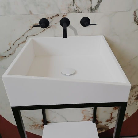 Mobile bagno di gusto minimal, a colonna, con lavabo in solid surface bianco satin leggermente svasato su un angolo. La struttura in ferro nero opaco offre un pratico ripiano porta-oggetti alla base.